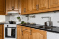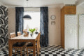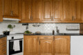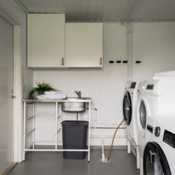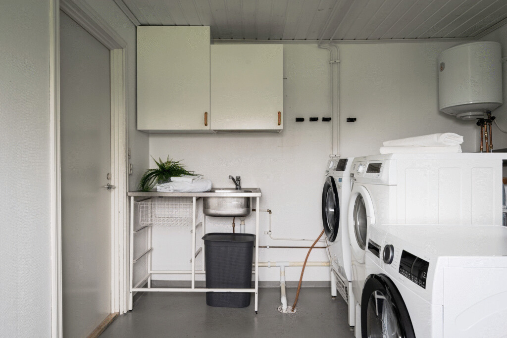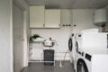 The apartment features a fully equipped kitchen, ideal for cooking meals at home, and a separate laundry room with two washing machines, a dryer, and hanging space for added convenience.