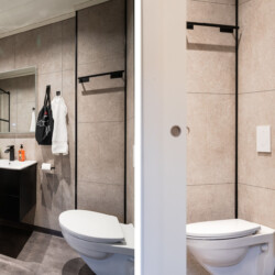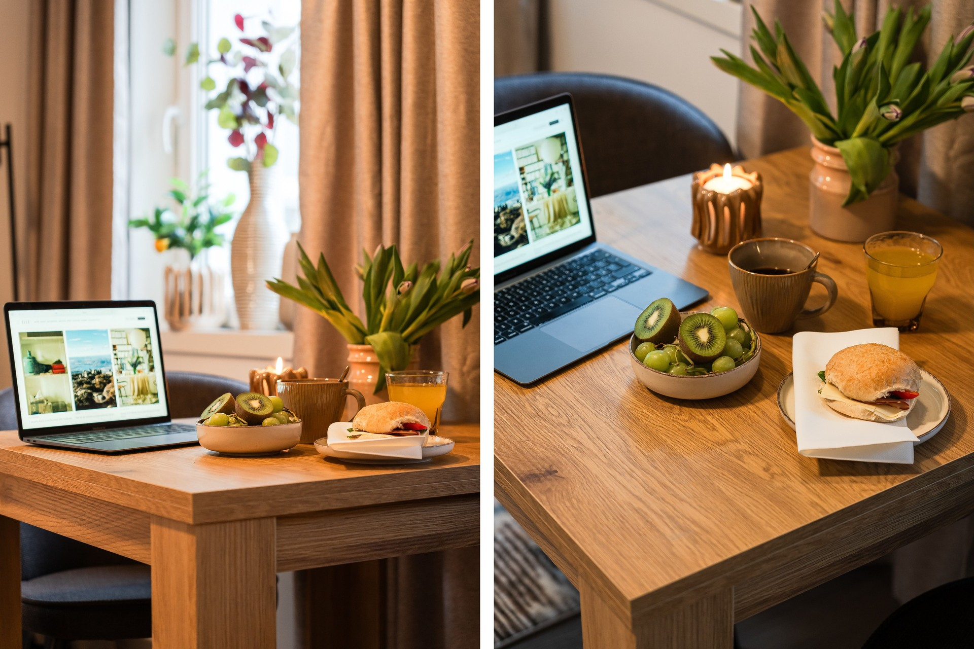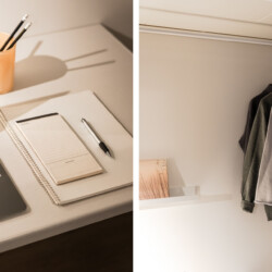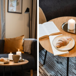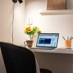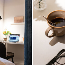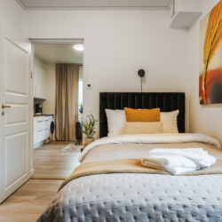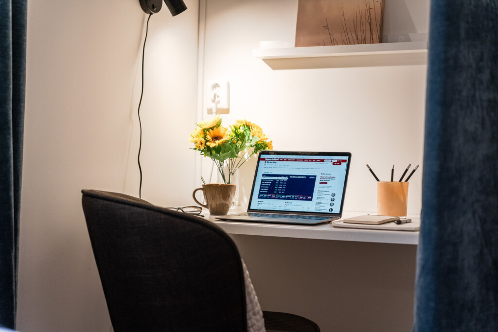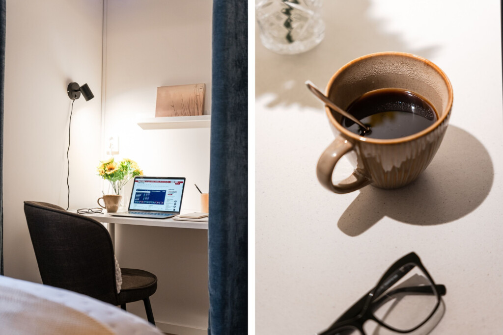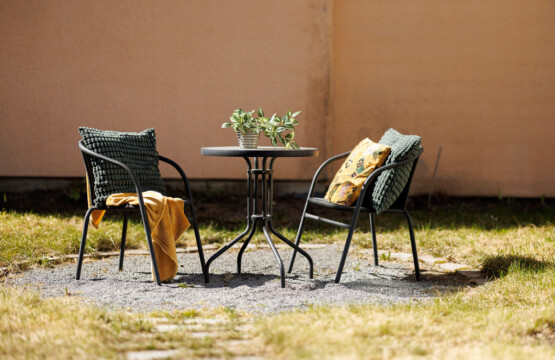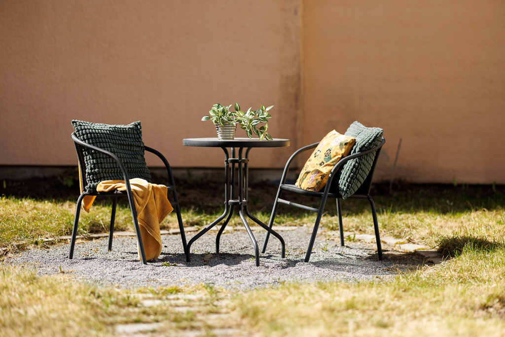 The bedroom features a comfortable 120 cm single bed, and the apartment is fully equipped for both work and relaxation. The calm, homely atmosphere and private courtyard setting create the perfect environment for longer stays, with access to two outdoor seating areas — ideal for morning coffee or an evening break.